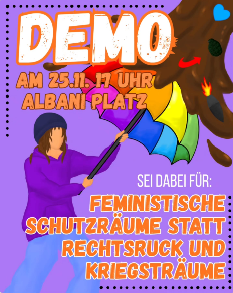 19. November 2025 19. November 2025Demoaufruf vom feministischen Bündnis GöttingenLiebe Mitstreiter*innen, liebe Interessierte, das feministische Bündnis Göttingen organisiert auch dieses Jahr zum 25.11. – […]